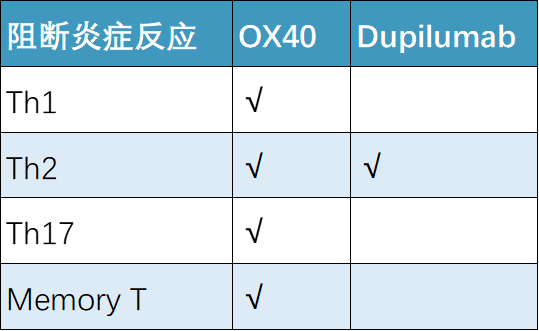 而OX40机制的不同之处在于,它并未直接掐断炎症效应分子和效应细胞的作用,而是通过调节异常活化的病理性T细胞的增殖、活化、记忆形成,抑制了Th1/Th2/Th17/Th22等多种T细胞介导炎症应答的起始和放大,因此具有作用范围广、扼制源头炎症应答的优点。