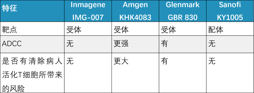 注:Amgen的KHK4083采用POTELLIGENT技术平台去除抗体Fc端糖链中的岩藻糖,极大地增强与FcγRIIIA的亲和力,增强ADCC功能。(1,2) Glenmark的GBR830为人源化的IgG1,具有典型单抗的Fc亲和力与ADCC功能。(3) Sanofi的KY1005为IgG4亚型,其Fc亲和力与ADCC功能均减弱。(4)创响生物的IMG-007降低了其ADCC功能。(5)对于细胞表面靶点,Fc结合介导的ADCC、ADCP、CDC活性可能带来安全风险,活性越强风险越大。(6)
