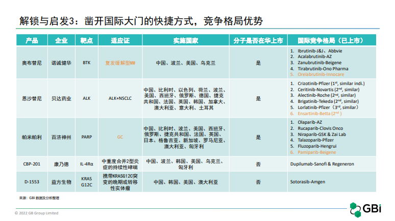 以诺诚健华的奥布替尼为例,目前全球已有5个BTK抑制剂,但是还未出现MM适应证获批。再如帕米帕利,作为百济神州很早之前就开始研发的分子,上市时已是全球第六个PARP抑制剂,但是GC适应证也无PARP获批。鉴于这些药的临床试验遍布诸多国家,每一个都可以成为其未来潜在的目标市场。因此,除了靶点之外,适应证和全球竞争格局的优势都应该是创新药出海的重点考量因素。