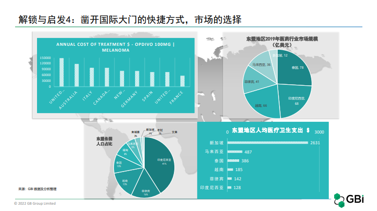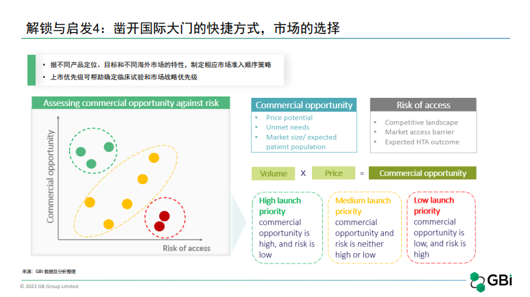 正如GBI此前发布的白皮书中所提及,目标国家的选择是一个综合性的考量,包括但不限于对疾病谱、注册监管、竞争格局、未满需求、患者群体/流行病学、税收环境等信息的了解。而对于全球市场的准入,可基于药物的国际参考定价、上市时间、报销时间、符合条件的患者人数等制定具体的准入策略和顺序。
