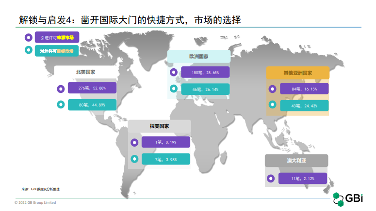 此外,据GBI SOURCE全球药品数据库交易板块对外许可相关数据,本土企业在北美的许可交易最多,从北美引进的产品占53%,许可到北美公司的产品占45%。但鉴于近期国际形势的变化,未来对外许可或将更多向着欧洲、亚太以及其他国家和地区探索出海的可能。