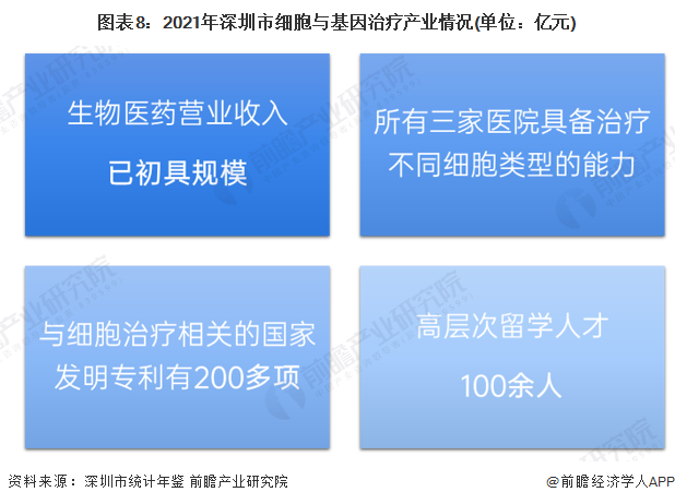根据《关于发展壮大战略性新兴产业集群和培育发展未来产业的意见》,新政重点聚焦生物医药、高端医疗器械等20大产业集群,重点培育发展细胞与基因等8大未来产业。在深圳市政府的不断支持下,深圳细胞治疗产业已初具规模;所有三甲医院都具备治疗不同细胞类型的能力;与细胞治疗相关的国家发明专利有200多项;行业吸纳高层次留学人员100余人;CDE受理的免疫细胞产品和企业数量居全国第二。