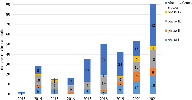 总体而言,从2013年到2021年,孤儿药的年度临床试验数量呈上升趋势,平均年增长率为61%。值得注意的是,2021年的临床试验数量明显增加,与2020年的数量相比,增加了70%。从2018年到2021年,I期和II期临床试验的总数呈现稳步增长,年增长率为87%。BE的数量逐渐减少,从2018年到2020年平均每年变化31%。但2021年BE的数量明显上升,与2020年的数量相比,增长了180%。