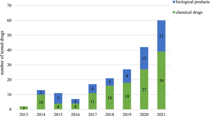 2013年至2021年,有124种药物接受了临床试验。在测试的124种药物中,82种(66%)是化学药物,42种(34%)是生物制品。测试的药物数量逐年增加,平均每年大幅增加53%(P = 0.0025)。从2019年到2021年,化学药物的数量逐渐增加,平均每年增加47%。而生物制品的数量逐渐增加,平均每年变化53%。此外,与2020年相比,2021年化学药品和生物制品的数量分别增加了44%和40%。