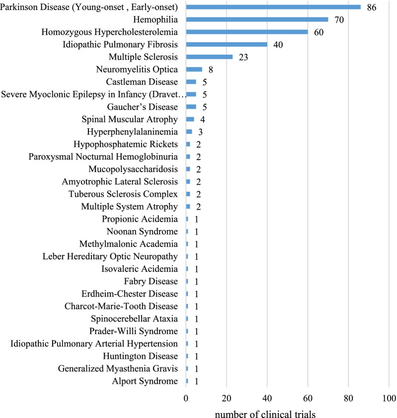 331项孤儿药的临床试验涵盖了《中国第一批罕见病目录》的31种罕见疾病。在这31种罕见病中,有5种分别有20项以上的试验。帕金森病(年轻发病,早期发病)是最常见的罕见病,有86项(26%)试验,其次是血友病(70,21%)、纯合子家族性高胆固醇血症(60,18%)、特发性肺纤维化(40,12%)和多发性硬化症(23,7%)。其余26种罕见病的试验数量各不超过10项。