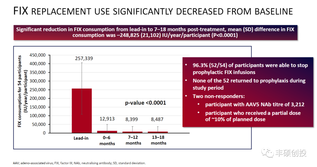 再看治疗后的出血事件数,这是实打实能看到的效果。接受Hemgenix治疗后患者平均ABR(年出血事件数)为1.51,而接受BBM-H901治疗后ABR已接近0,10名患者中仅1名患者治疗后仍有出血事件发生,其他9名患者无任何出血,也不再需要FIX输注。看治疗后ABR这个指标,BBM-H901更胜一筹。当然,BBM-H901此次试验患者数目少,不知扩大样本后是否结果依旧一致。