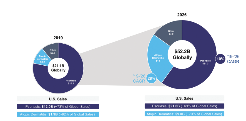 银屑病和特应性皮炎是免疫皮肤病学的两个最大市场,预计到2026年,其在美国的总销售额将达到约310亿美元,在全球的总销售额将达到440亿美元。局部治疗是皮肤病治疗的基础,占2020年美国皮肤科医生处方的83%。