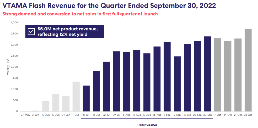 自5月发布以来,截至2022年9月30日,VTAMA®产品净收入为500万美元,净收益率为12%。