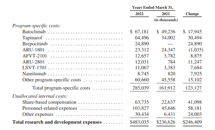 2021年度该公司未从销售候选产品中获得任何收入,收入主要来自确认收到的与许可协议有关的预付款,还包括一些订阅费和服务费。随着FDA于2022年5月批准VTAMA®乳膏用于治疗成年斑块型银屑病患者,公司在首次推出产品后开始确认产品收入成本。