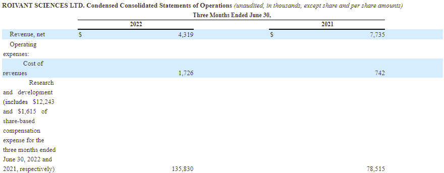 2022年8月15日,Roivant发布2022年第一季度报告。(2022年4月1日~2022年6月30日)2022年第二季度净收入$431.9万,去年同时期公司净收入$773.5万,同比降低44.16%。公司今年第一季度研发费用为$1.36亿,去年同时期研发费用为$7852万,同比增长73.00%。