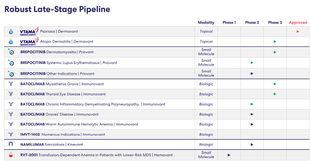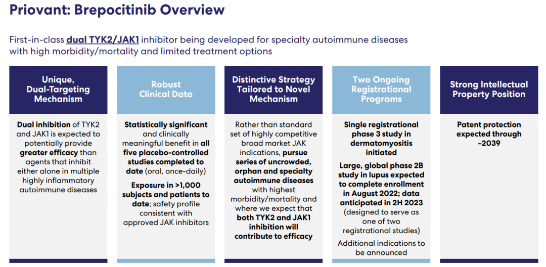 药融云数据,www.pharnexcloud.com显示:2022年6月28日,Pfizer(辉瑞)和Roivant宣布,两家公司共同创建的PriovantTherapeutics(简称“Priovant”),一家致力于开发和商业化治疗自身免疫性疾病新疗法的公司,正在进行brepocitinib治疗皮肌炎和狼疮的注册研究,目前上述领域几乎没有获批的疗法。Priovant成立于2021年9月,辉瑞公司授予Priovant口服和外用brepocitinib全球开发权以及美国和日本的商业权利,并持有Priovant25%的股权。