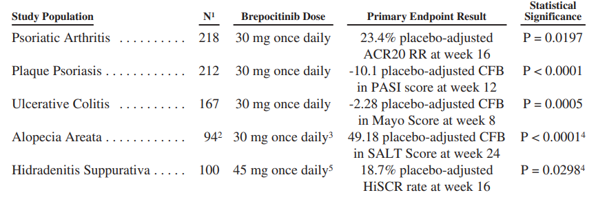 Brepocitinib已经在五项已完成的对照2期研究中对免疫性疾病(银屑病关节炎、斑块状银屑病、溃疡性结肠炎、脱发症和化脓性皮炎)进行了评估。在所有这五项研究中,使用布雷博西尼治疗与统计学上显著的和有临床意义的疗效有关。