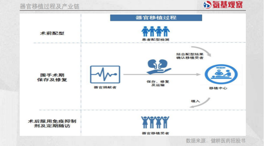 每一阶段都需要用到相应的医疗器械产品,比如术前术后检测IVD产品、器官储存/转运器械产品等。
