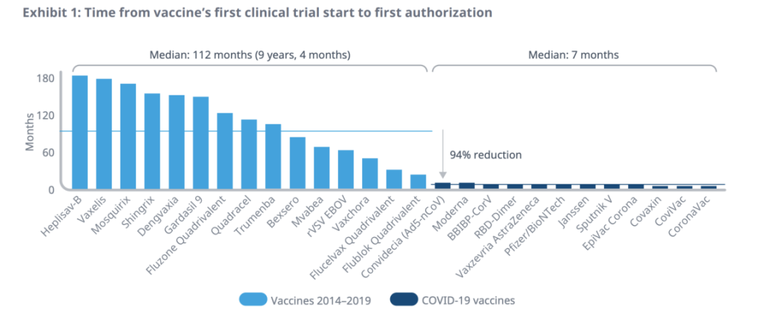 SARS-Cov和MERS-Cov疫苗平台的经验、测序技术的普及、mRNA疫苗平台、载体等技术的成熟,以及新冠病毒的测序共享,使得能在符合监管规定前提下,实现近乎实时的疫苗开发。IQVIA表示,研究人员在数周内就完成了从病毒鉴定到临床前实验,3个月内将进度推至临床试验阶段。