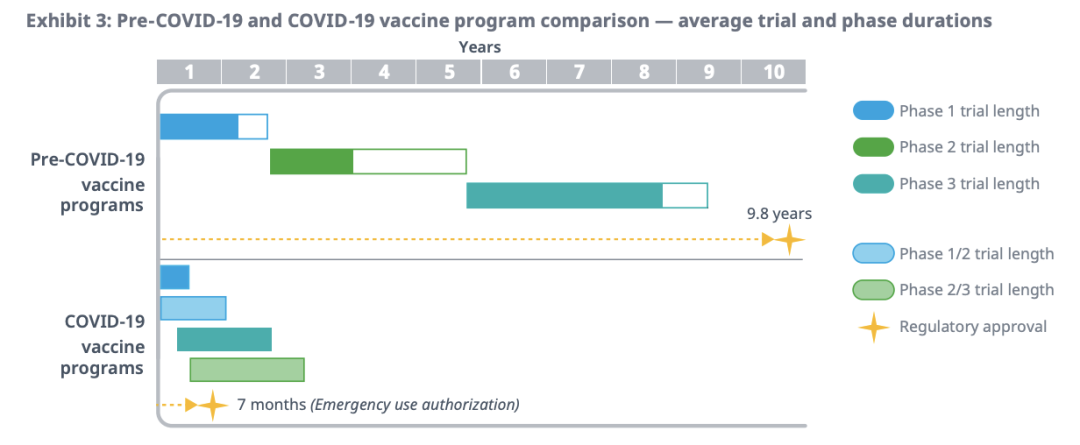 IQVIA得出结论:在去风险化背景下,同时推进临床与生产,是新冠疫苗快速上市的主要原因。由图表可以看出,在I期试验结束之际,新冠疫苗的II/III期试验几乎立刻启动。一旦收集到足够的安全性和有效性数据,立刻申请EUA(紧急使用授权)。