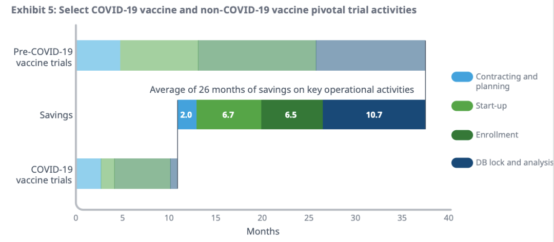 此外,IQVIA还对单个试验的进度进行分析,详细到试验执行的每个阶段——合同签订、研究启动、入组、治疗以及数据库的锁定和分析等。结果发现,相比之前的疫苗研发,新冠疫苗的开发时间大约缩短了26个月,即提升70%的开发速度。