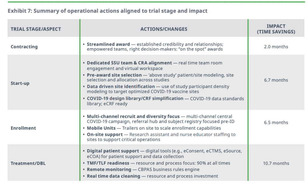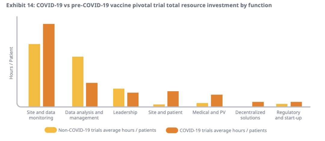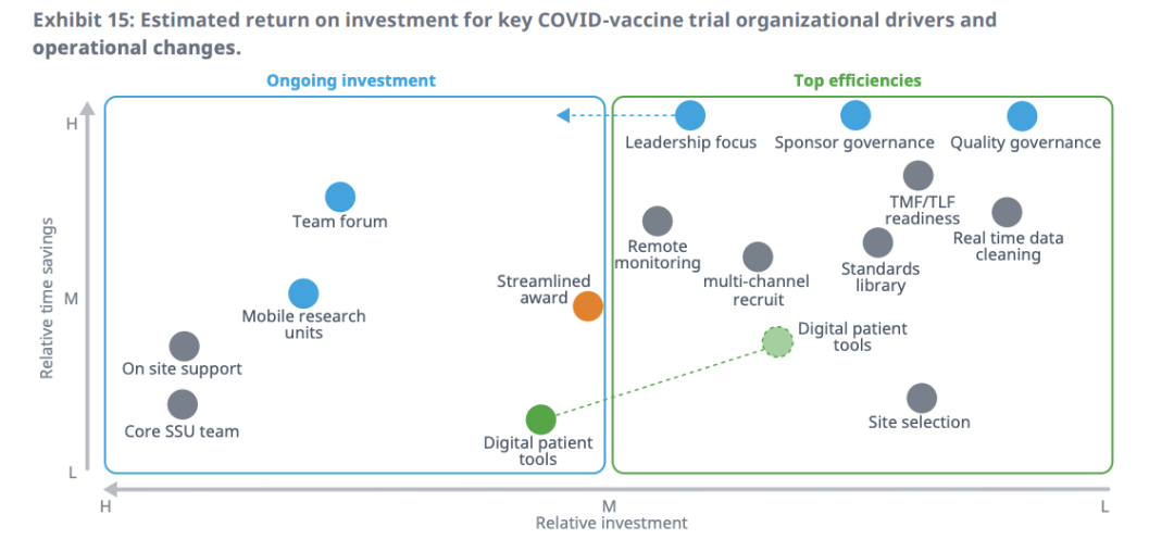 持续的投资,则是指与资源强度密切相关的流程投资。比如数字研究受试者等方面的创新,在新冠疫苗试验中发挥关键作用,但仍需要进一步的行业投资以实现规模化。另外,现场支持和移动研究单位等解决方案,通过增加资源强度来获得时间上的优势,适合大规模的招募和受试者处理。