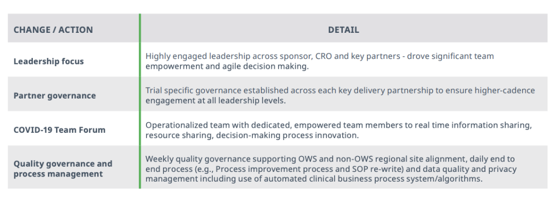 组织调整方面,比如实施重点组织结构,优化领导层参与、申办者和CRO关系、团队工作结构以及质量和流程管理机制,以便更好的地支持运营行为。