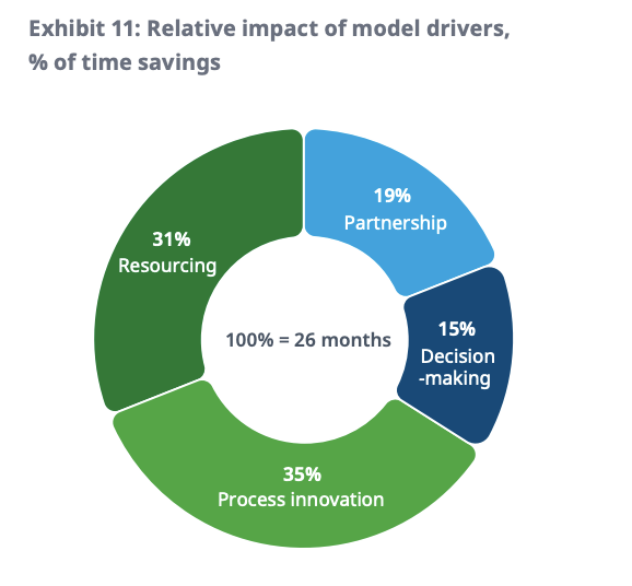 模型驱动是指,在新冠疫情背景下,基本的行为与商业模式发生了根本性的转变,在伙伴合作、决策过程、流程创新和资源优化等因素影响下,加速试验进程。其中,后两者则是最大的效率贡献者,分别占到了35%和31%的份额。
