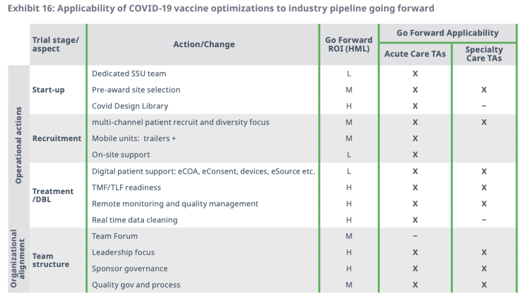 投资回报率分析也凸显出一系列高效的变化,暗示在疫苗试验之外,上述创新转变因素具有推动其他产品价值的潜力。另外,更加密集的投资,也有力催动创新落地的实践,当然这方面,也纳入了大规模或者时效性试验中更为强调的速度指标的考虑。