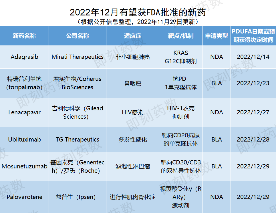 根据PDUFA的预期目标日期,预计12月,美国FDA将对6个创新药物的批准做出监管决定。