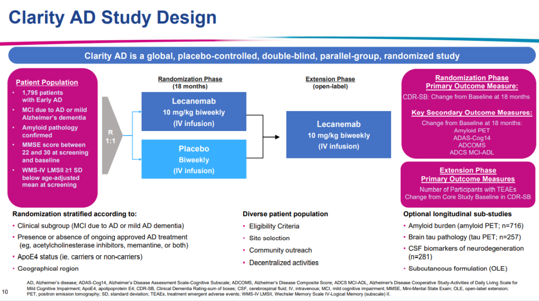 会议由来自东京大学的Takeshi Iwatsubo教授主持,卫材临床研究副总裁Michael Irizarry开场介绍了研究背景和设计。Clarity AD是一项为期18个月的全球、安慰剂、双盲、平行、对照、开放期延续的III期临床试验,旨在评估仑卡奈单抗治疗早期阿尔茨海默病(AD)患者的有效性和安全性。该研究共纳入1795例经Aβ-PET或脑脊液确认脑内存在AD病理改变,MMSE评分22-30分的早期AD(包括AD源性的轻度认知功能障碍和轻度AD)患者,以1:1的比例随机接受仑卡奈单抗(10 mg/kg静脉注射,每两周一次)或安慰剂治疗(图1)。