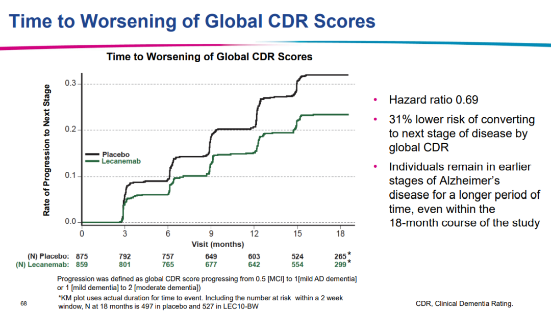 同时根据CDR总分评估,仑卡奈单抗治疗转入下一阶段疾病的风险降低31%(HR: 0.69)。(图3)基于CDR-SB斜率分析显示,如仑卡奈单抗持续治疗至25.5月,临床衰退将与安慰剂治疗18月时相当,证实其可延缓疾病进展达7.5个月。