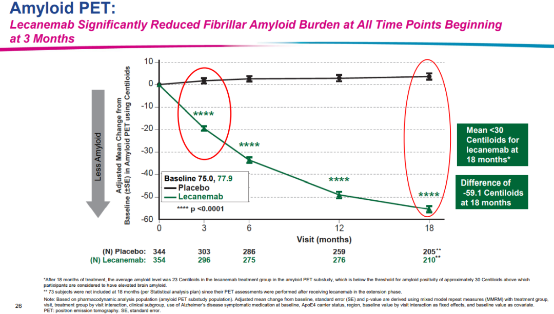 作为一种人源性抗Aβ原纤维的单克隆IgG1抗体,仑卡奈单抗可通过小胶质细胞靶向清除毒性Aβ聚集体如可溶性原纤维和寡聚体,延缓AD患者的神经退变和认知能力的下降。会议上公布了仑卡奈单抗治疗后降低脑脊液内Aβ水平的结果。18月时,Aβ降低了59.1 centiloid。仑卡奈单抗治疗18个月后,平均淀粉样蛋白PET为22.99 Centiloids,低于淀粉样蛋白的阳性阈值(30 Centiloids)(图4)。