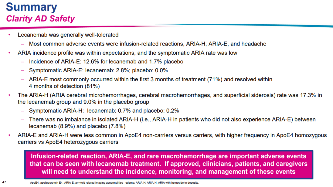 来自美国巴罗神经学研究所的Marwan Sabbagh教授详细介绍了安全性方面数据,仑卡奈单抗治疗中最常见的不良事件是输液反应,仑卡奈单抗治疗组26.4%的患者出现轻度至中度的输液反应。临床上备受关注的淀粉样蛋白相关影像学异常-渗出/水肿(ARIA-E)在仑卡奈单抗治疗组发生率为12.6%,安慰剂组为1.7%。ARIA-出血(H)在仑卡奈单抗治疗组发生率为17.3%,安慰剂组为9.0%。在研究期间,仑卡奈单抗组和安慰剂组中患者死亡率分别为0.7%和0.8%。无药物治疗相关死亡。(图6)