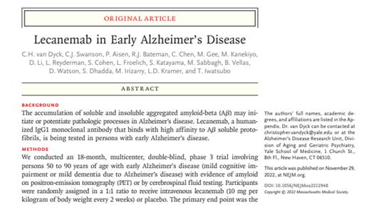 美国时间2022年11月29日-12月2日在旧金山举办的第15届阿尔茨海默病临床试验会议(CTAD)开幕首日,万众瞩目的淀粉样蛋白(Aβ)靶向治疗药物Lecanemab(仑卡奈单抗,BAN2401)研究团队报告了全球Clarity AD研究Ⅲ期临床结果。