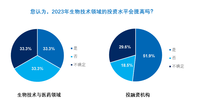 在经历了今年的融资低潮后,参与问卷调查的医药人们对产业明年的态势持乐观态度。来自生物技术和医药产业的高管群体有三分之一相信明年的产业投资水平会进一步提高,而这一比例在投资人中则提升到了51.9%,超过一半。总体看来,大家倾向于认为今年的“融资难”只是暂时现象。