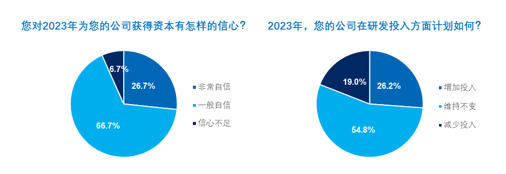与之类似,在预测自己所属公司在明年的情况时,有超过九成的产业高管对获得资本“非常自信”或“一般自信”,“信心不足”的占比只占6.7%。而在研发投入预期中,也有超过八成相信自己的投入不会低于2022年,更有超过四分之一预期将进一步增加投入。