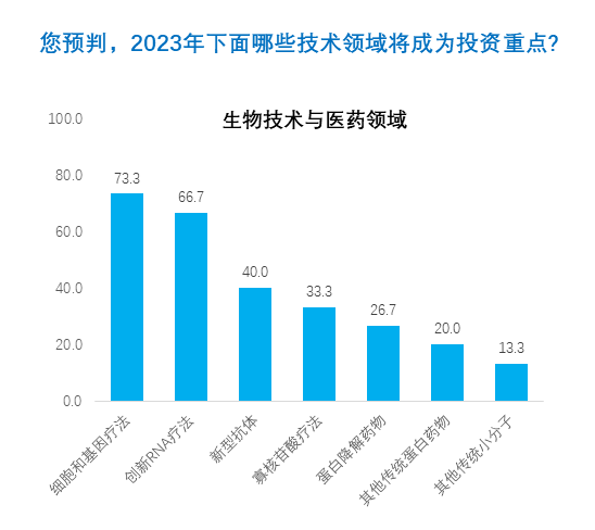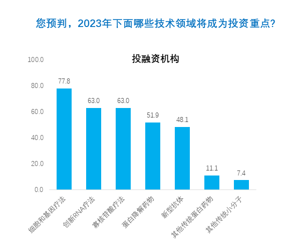 在其余技术领域中,新型抗体、寡核苷酸疗法以及蛋白降解药物也广受企业高管与投资人们的看好。相比传统的小分子药物和蛋白类药物(如抗体),这些新分子类型的得票率更高。而在投资人群体看来,这些领域的投融资优势也更为明显。