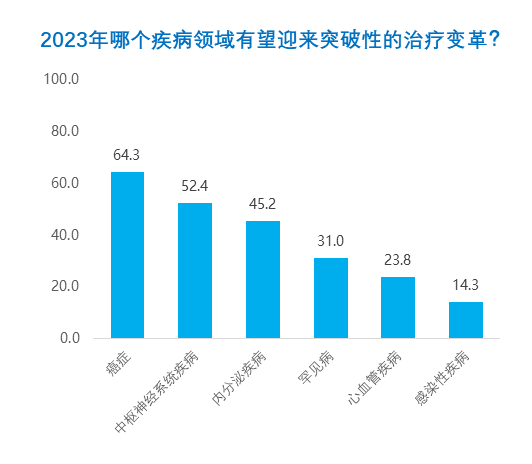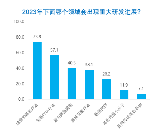 与之类似,参与调查的医药人们也看好这五大领域有望在明年出现重大的研发进展,其中细胞和基因疗法呈断崖式领先。考虑到目前细胞和基因疗法存在递送、生产以及安全性等种种挑战,这也表明产业更急迫地看到更多解决挑战的方法,释放这类革命性疗法的潜力。