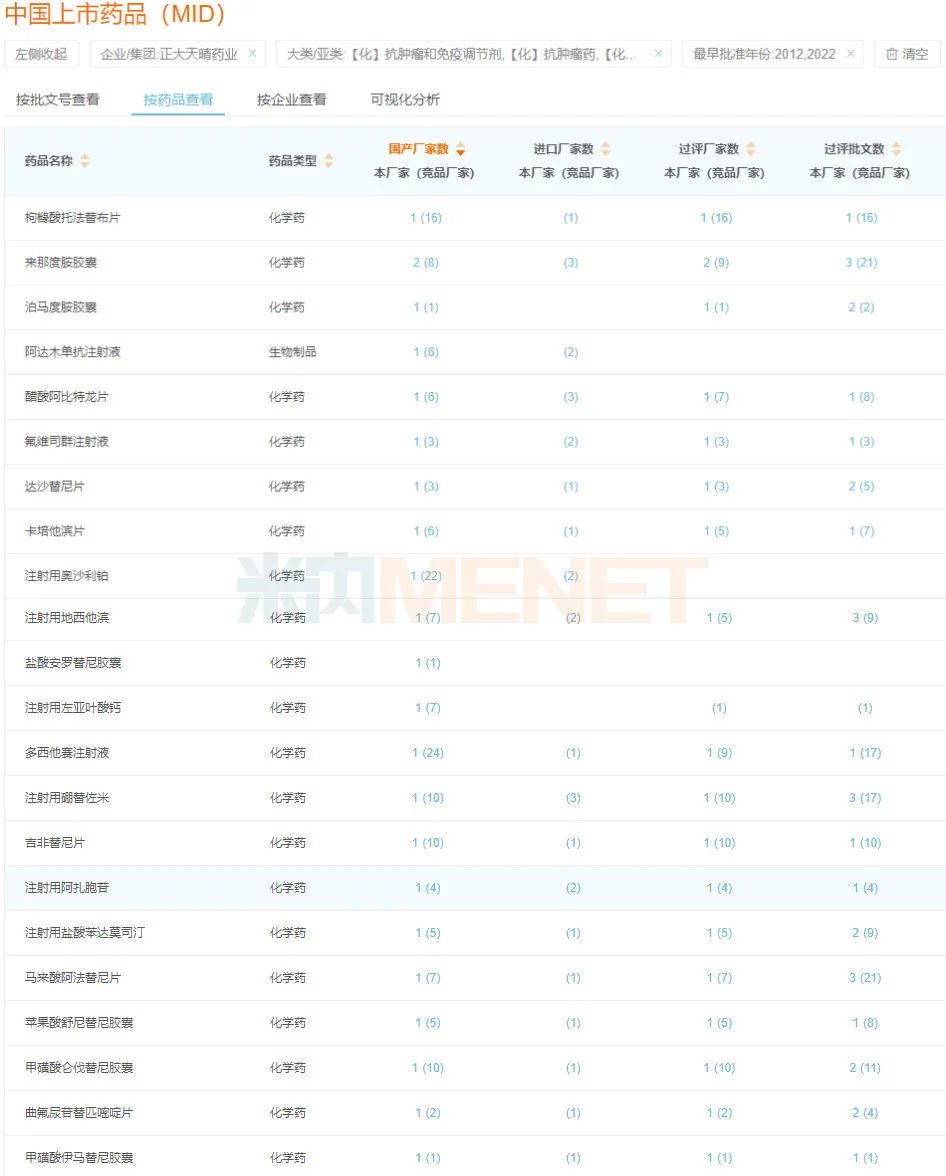 近十年来,正大天晴药业有20余款抗肿瘤和免疫调节剂获批上市,包括1类新药盐酸安罗替尼胶囊及派安普利单抗注射液、生物类似药阿达木单抗注射液以及多款首仿(甲磺酸仑伐替尼胶囊、氟维司群注射液、泊马度胺胶囊、注射用盐酸苯达莫司汀、注射用阿扎胞苷、枸橼酸托法替布片、达沙替尼片等)。