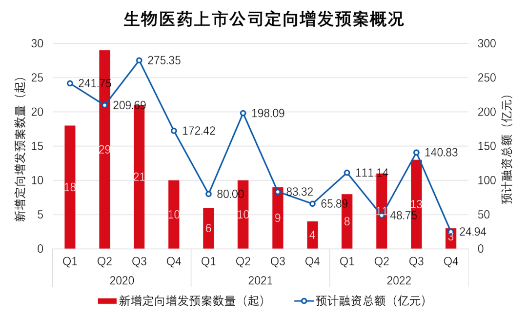 图1 生物医药上市公司定向增发预案概况(统计期间:2020年-2022年10月31日)数据来源:康橙投资、Wind