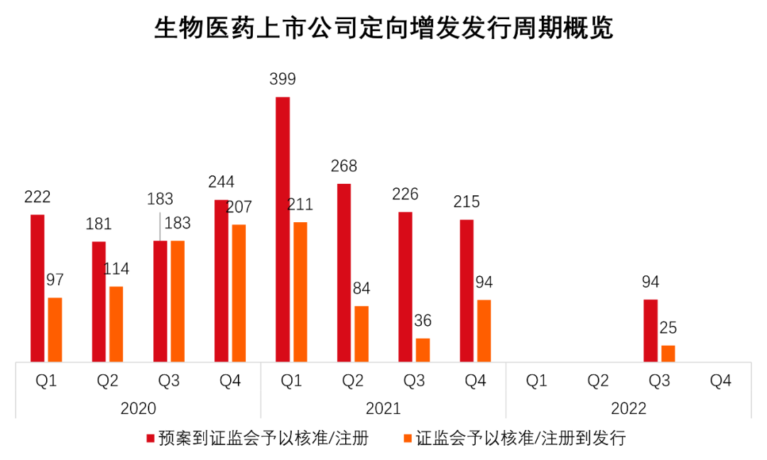 图4 生物医药上市公司定向增发发行周期概览(统计期间:2020年-2022年10月31日) 数据来源:康橙投资、Wind