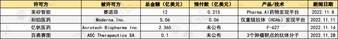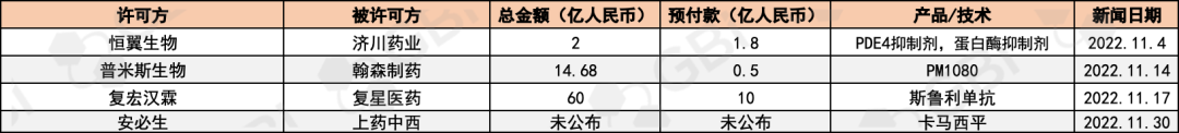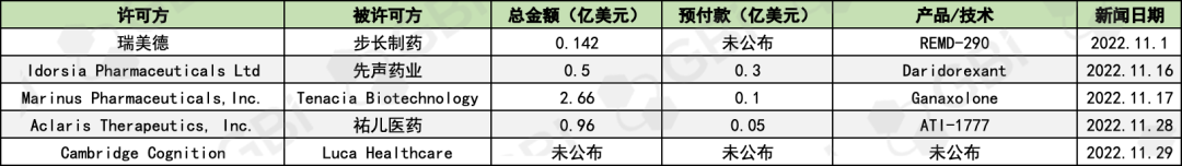 2022年11月,本土企业的许可引进(License-in)、对外许可(License-out)以及内资企业间的许可交易活跃度相较于10月有所恢复。根据GBI SOURCE数据库全球交易板块,共有以下12笔相关交易,主要涵盖肿瘤、心血管系统、神经系统等领域。