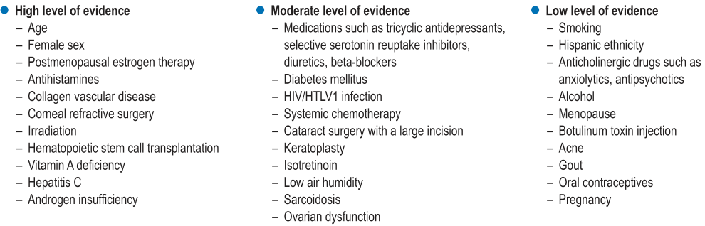 干眼症的诱发因素,主要分为高诱发因素、中等程度诱发因素以及低等程度诱发因素,如维生素A缺乏、眼角膜移植手术以及吸烟等因素都可能增加干眼症的患病几率。