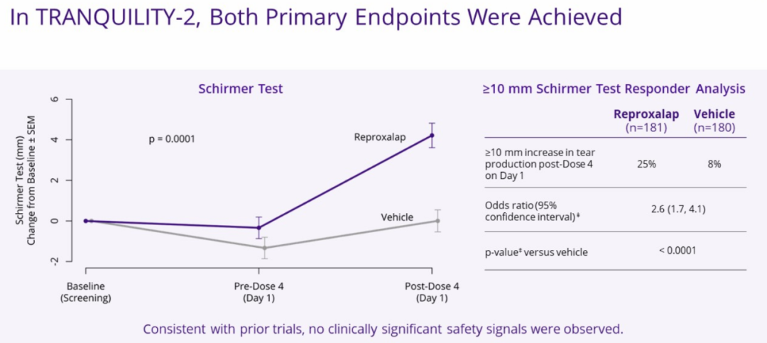 即给药一天后,Schirmer测试(p=0.0001)和≥10 mm Schirmer测试中,reproxalap在统计学上均优于载体。(Schirmer试验是测量眼内泪液分泌的一项指标,是最常用于干眼症药物批准的观指标之一。)