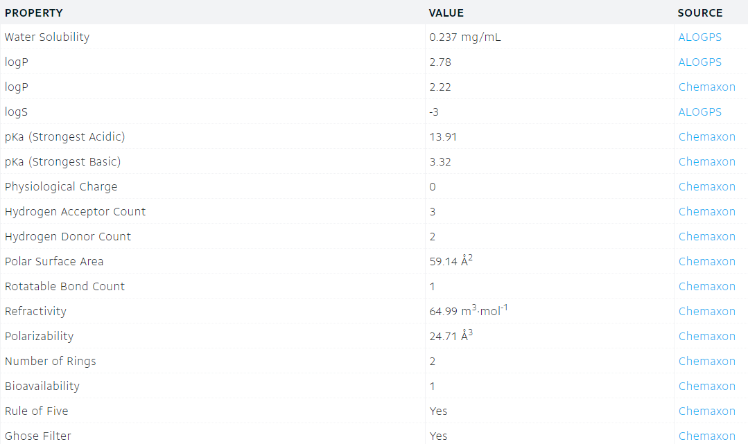 reproxalap是一种活性醛类抑制剂,reproxalap主要通过结合和捕获游离醛来治疗眼部疾病。下图为reproxlap的一些预测性质(来源DrugBank)。
