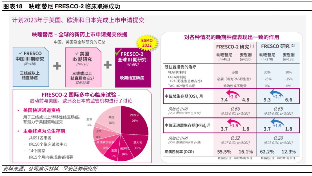 从FRESCO-2临床设计来看,为呋喹替尼获得FDA批准打下了坚实的基础:1)采用了肿瘤金标准OS指标作为主要终点,且临床数据展现出了显著的优效;2)入组691名患者主要来自于欧美国家(美国占18%),人群多样性丰富;3)呋喹替尼曾获得美国快速通道资格,启动临床前与监管机构充分交流。