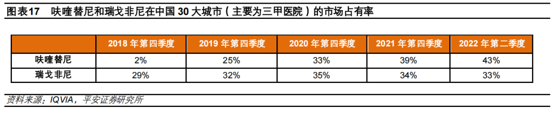 虽然呋喹替尼上市较瑞戈非尼晚,但其凭借更好的疗效和安全性在国内30大样本三甲医院市占率中反超了瑞戈非尼。