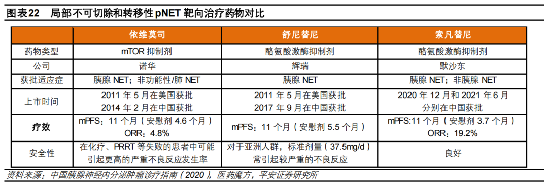 神经内分泌瘤目前唯一治愈的方法仍是手术切除,面对不可切除的肿瘤可选择的非化疗药物较少,包括生长激素类似物、分子靶向药、放射疗法。而靶向疗法中只有两类药物,分别是MKIs抑制剂(索凡替尼、舒尼替尼)、mTOR抑制剂(依维莫司)。