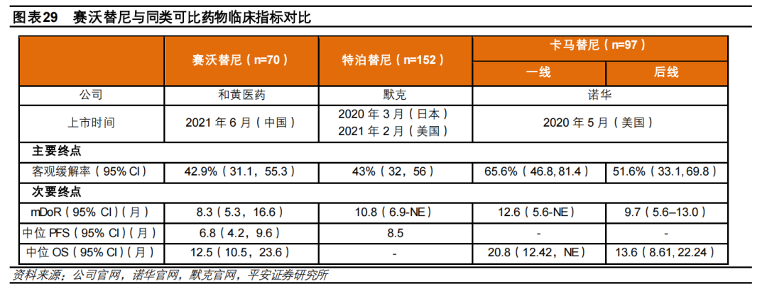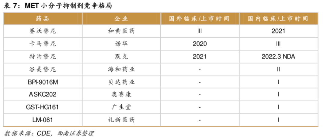 目前,和黄医药的赛沃替尼是国内唯一一个获批的MET抑制剂,同类竞品特泊替尼、卡马替尼均仅在海外上市,赛沃替尼国内已获批适应症为MET外显子14跳变的非小细胞肺癌。