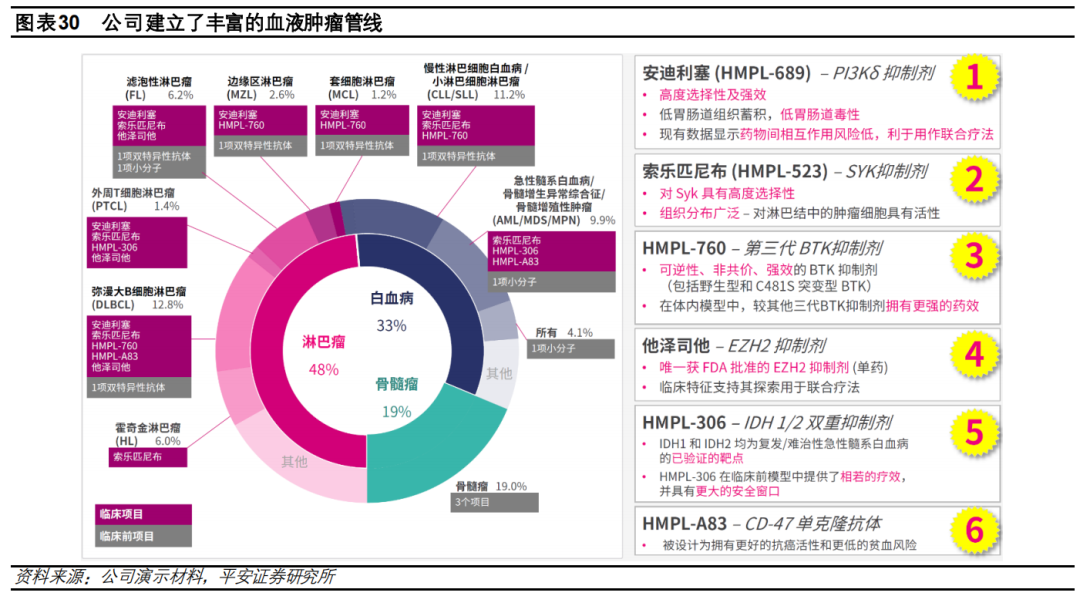 尽管公司拟定战略聚焦后期管线,但仍不应忽视的是,除了三款已经上市的商业化产品,和黄医药积极布局血液瘤领域,还拥有6款临床阶段小分子靶向药,一定程度体现研发能力。