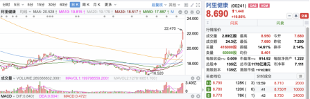 其中,作为国内头部医疗健康服务平台的阿里健康迎来久违的拉升趋势,收盘价为8.79元/股,涨幅超19%;平安好医生、京东健康分别上涨22.22%及15.38%。而大参林、老百姓、益丰药房等药店零售股也大幅走高。