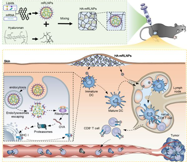 2022年11月11日,中国科学院国家纳米科学中心王海研究团队在Advanced Functional Materials期刊发表了一篇研究论文。该研究开发了一种水凝胶-LNPs系统(HA-mRLNPs),可以有效地将编码肿瘤抗原的mRNA递送到树突状细胞进行抗原呈递,诱导抗原特异性CD8+T细胞杀伤肿瘤细胞,而且可在室温下储存。该研究证明稳定和持久免疫水凝胶-LNPs体系可用于有效的肿瘤免疫治疗。