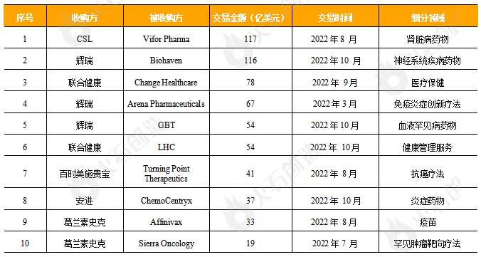表1:2022年全球医药健康领域十大并购交易事件