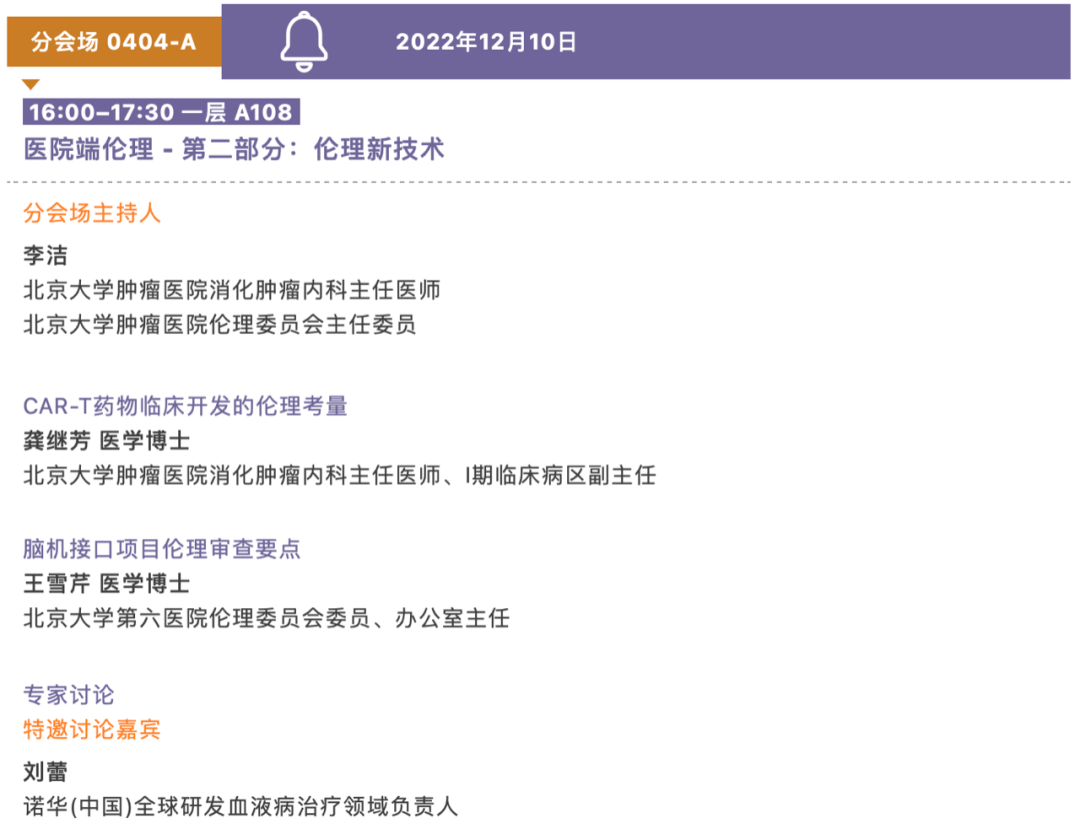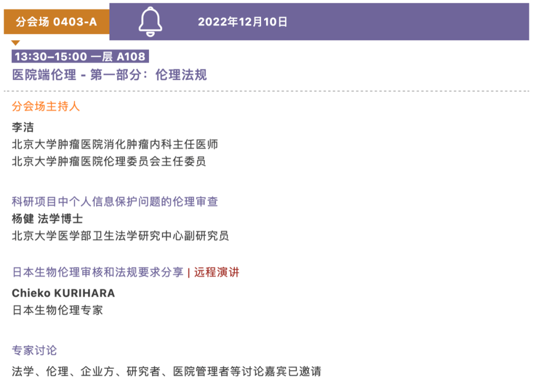 李洁:今年的DIA年会中设置了伦理模块,法规专场以《中华人民共和国个人信息保护法》为基准讨论伦理应该注意的问题,并邀请日本生物伦理专家分享“日本生物伦理审核和法规要求”。新技术方面有两个话题,一是细胞免疫治疗方面的(主要介绍CAR-T),另外一个是关于“人工智能脑机接口”方面的,契合了今年“两办”发布的《关于加强科技伦理治理的意见》。参与讨论的嘉宾包括法学、伦理学专业,还有企业方、研究者、医院管理方的代表,希望从不同角度关注监管,提高认识,加强伦理治理。